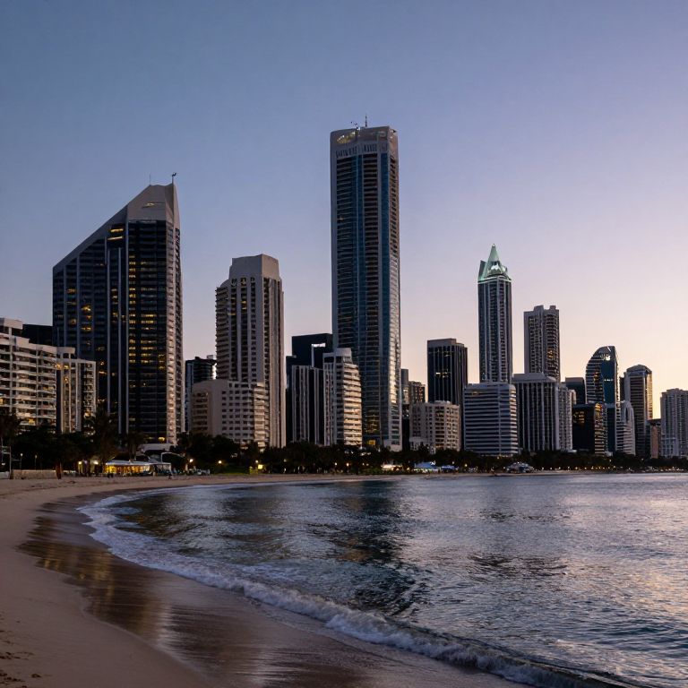 Surfers Paradise at dusk whispers a symphony of serenity and ambition, where the rhythmic pulse of the ocean mirrors the city's vibrant heartbeat, inviting contemplation amidst the eternal dance of light and shadow.