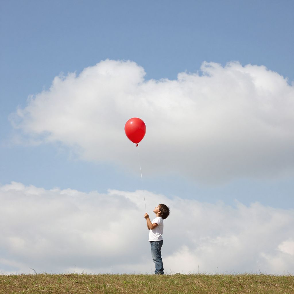 A child stands in a field, holding onto the strings of a red balloon that floats serenely among fluffy white clouds, defying gravity and merging seamlessly with the sky.