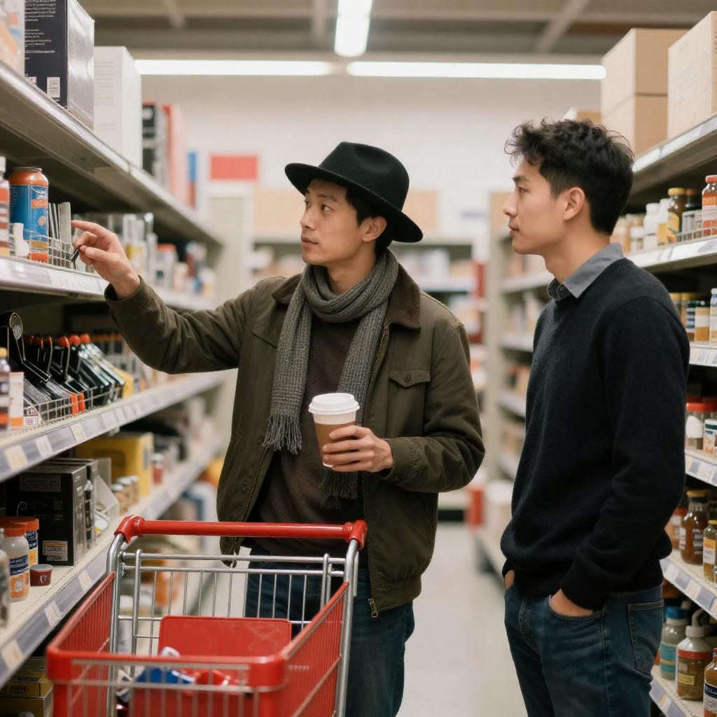 Photograph of four men walking in a brightly lit supermarket aisle. The man on the left wears a white shirt and glasses, the second man in a red shirt and black jacket, the third in a gray shirt and blue jacket, and the fourth in a plaid shirt and jeans. Shelves with products line the background.