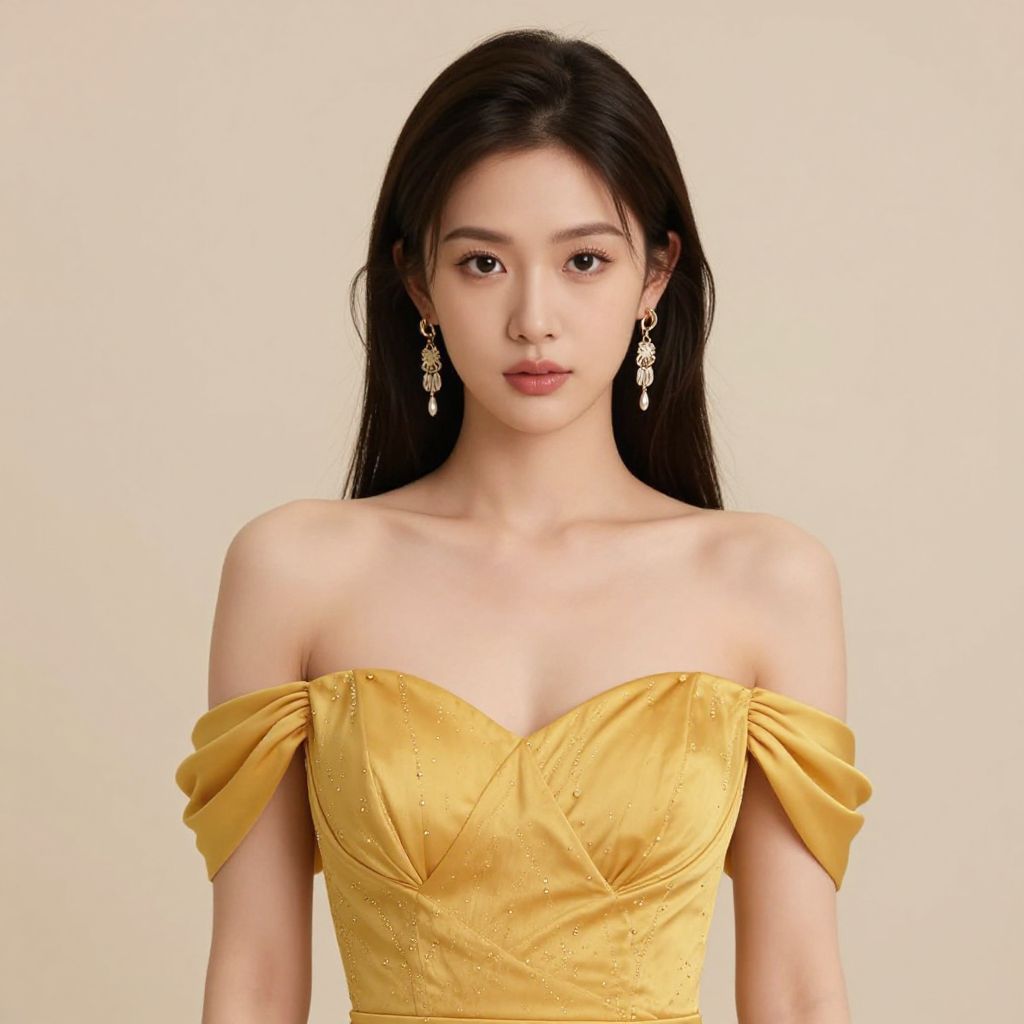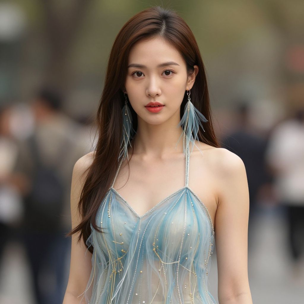 Photograph of a young Asian woman with long, straight, dark brown hair and fair skin. She wears a sheer, silver, strapless dress with delicate gold and blue sequins, revealing a hint of a light blue bra underneath. Her makeup is minimal, with a natural look and a subtle red lip. She has blue, feather-like earrings. The background is blurred, showing a crowd and greenery, indicating an outdoor event. Her expression is neutral, and she stands confidently in the center of the frame. The image has a soft, shallow depth of field, focusing on her face and upper body.