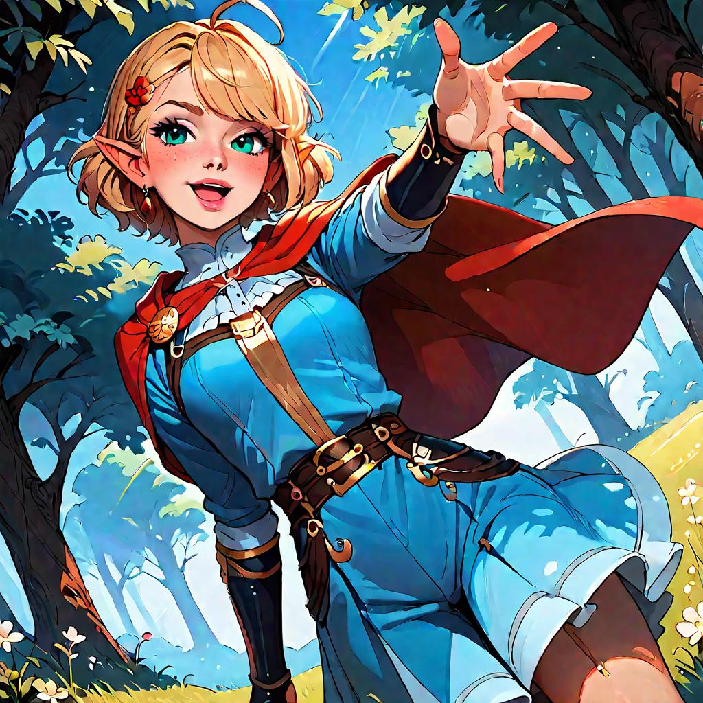 Score_9, score_8_up, score_7_up, source_anime, rating_safe, score_9, rating_explicit, rena lanford, 1girl, ahoge, blue hair, short hair, blue eyes, pointy ears, small breasts, crescent hair ornament, leather armor, red cape, blue vest, red ribbon, waist ribbon, blue skirt, miniskirt, smile, happy, open mouth, reaching towards viewer, dutch angle, forest, light particles, flower, tree, grass, sunlight, tree shade, lens flare