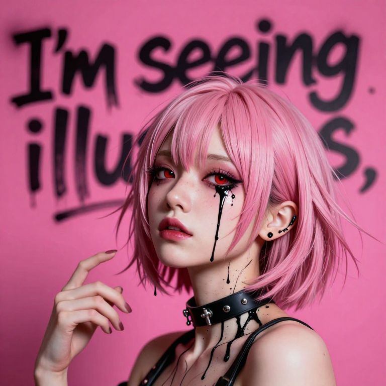 From above, POV, perspective, Photorealistic image, Create lose up macro shot of a stylized hyper-realistic Japanese girl with short, messy pink hair and piercing red eyes, Her facial features are defined, with a strong jawline and a confident expression, The character has a rebellious, punk aesthetic, wearing a black choker with metallic details, with a slightly angled view, showing a close-up facial expression and detailed makeup, Black liquid drips dramatically down her face, covering her ears and neck, appearing to be flowing from her ears, front of a solid vibrant pink background, prominently displayed in image graffiti in bold letters reads \"I'm seeing illusions, \" font, The overall atmosphere is edgy, intense, and modern, with a focus on contrasting dark and bright colors, and a gritty, expressive art style, The overall style is fashion-forward and somewhat dramatic, emphasizing form and contrast against the background, The figure is presented in a three-quarter profile view, photorealistic photo, photography, dynamic, energetic, dramatic lighting, shallow depth of field, cinematic lighting, extremely intricate detail character, accurate depiction of character, correct body anatomy, correct hands and fingers, extremely intricate skin and facial texture detail, design, lifelike potrayal, extrememly realistic lighting, extreme dynamic pose, sharp background detail