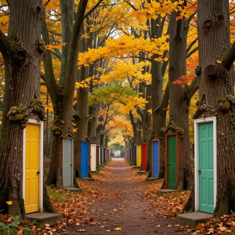 A whimsical forest pathway lined with towering trees whose trunks sprout colorful doors, inviting passage into parallel worlds of vibrant autumn hues and ethereal light.