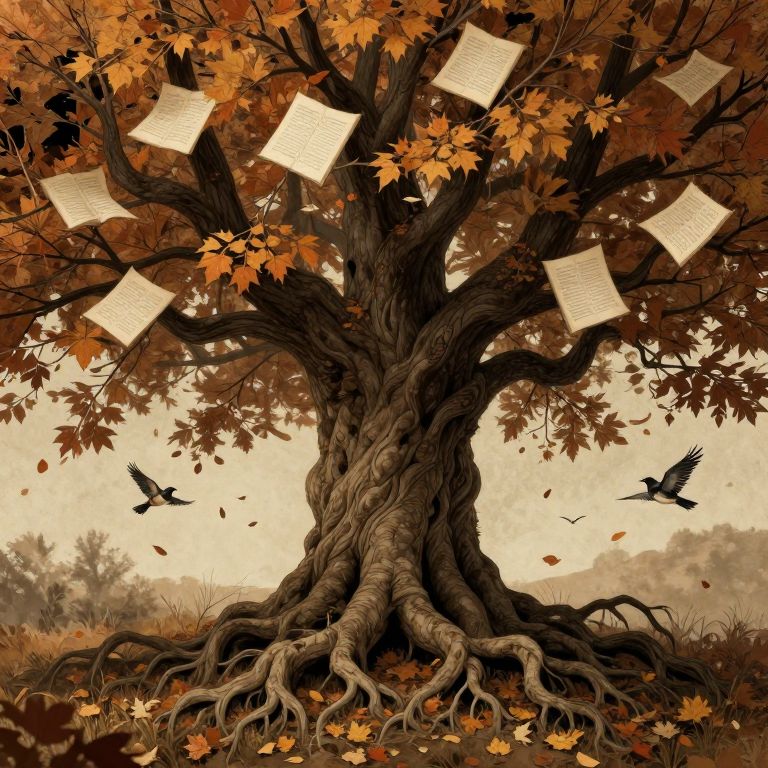 A hauntingly detailed digital illustration depicts a gnarled tree with sprawling roots and branches adorned with autumnal leaves, each resembling a manuscript page, as birds flutter amidst the falling foliage, evoking a surreal, vintage atmosphere.