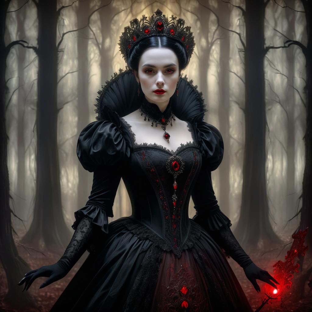 Portrait of a ghostly noblewoman with pale skin and piercing red eyes, wearing an ornate black gothic dress adorned with red jewels and intricate lace. She stands in a haunting forest with towering dark trees, illuminated by dramatic moody lighting and muted sepia tones, creating a mysterious and eerie atmosphere.
