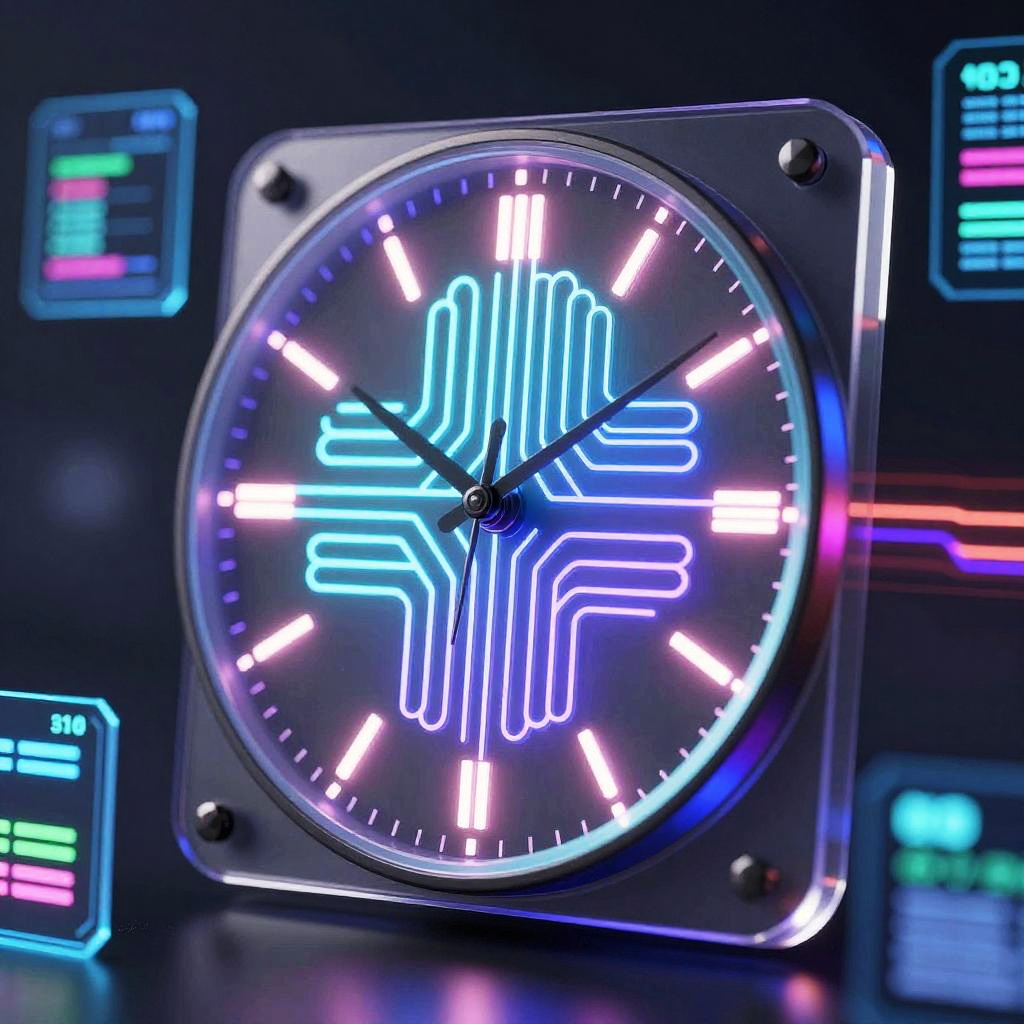 Close-up of an AI clock embedded in a transparent screen device, neural network patterns pulsating inside, dynamic light trails representing data flow, surrounded by futuristic UI elements with holograms, dark background highlighting neon colors and instant time updates