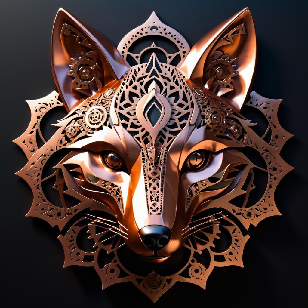Detailed portrait of a mechanical fox crafted from polished copper featuring intricate gear patterns and cogs. The artwork showcases sharp metallic textures with dramatic lighting highlighting the complexity and symmetry of the gear design, set against a dark background.