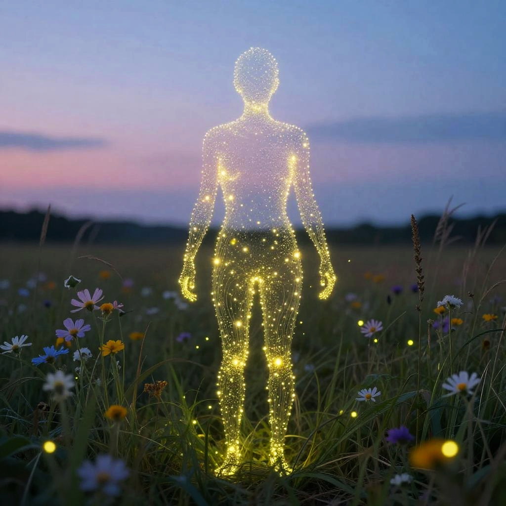 Human outline composed of thousands of tiny glowing fireflies, set in a twilight meadow with wildflowers and tall grass, magical realism style, gentle swirling motion, soft pastel colors, dreamlike atmosphere
