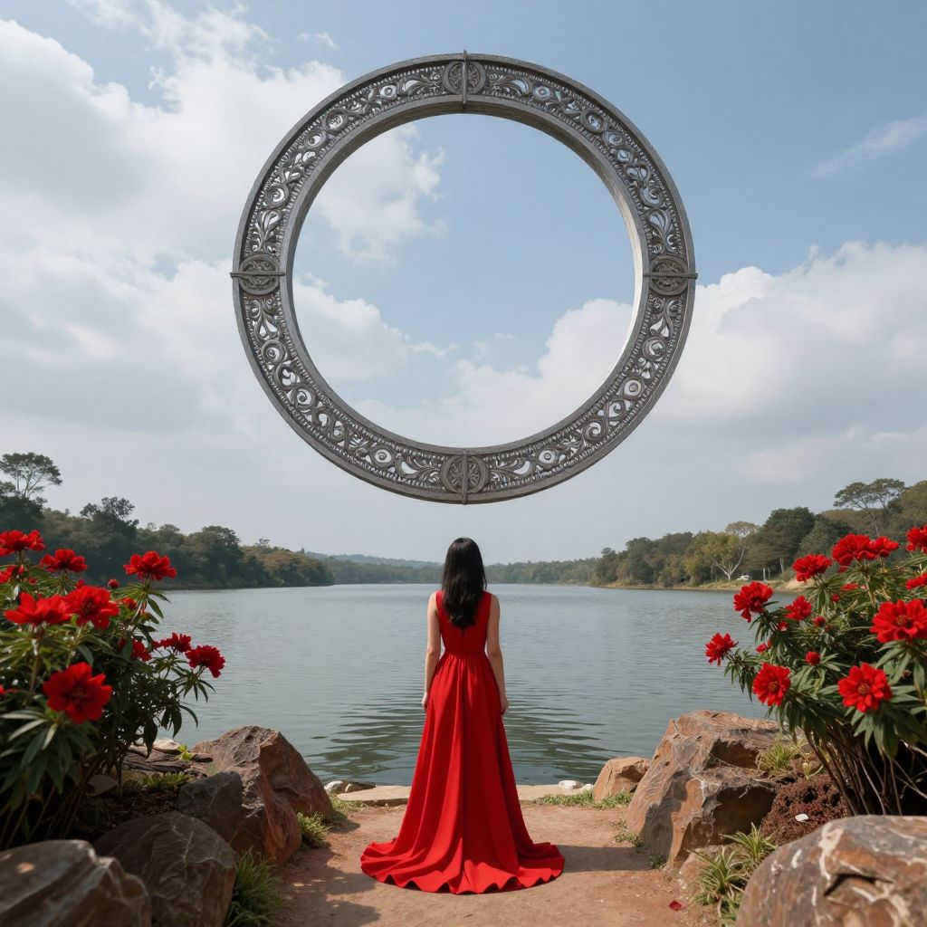 A woman in a vibrant red dress stands before a serene lake, framed by a massive circular structure hovering above, its intricate design reflecting the tranquil sky and clouds, while blooming red flowers flank her path amidst rugged terrain.