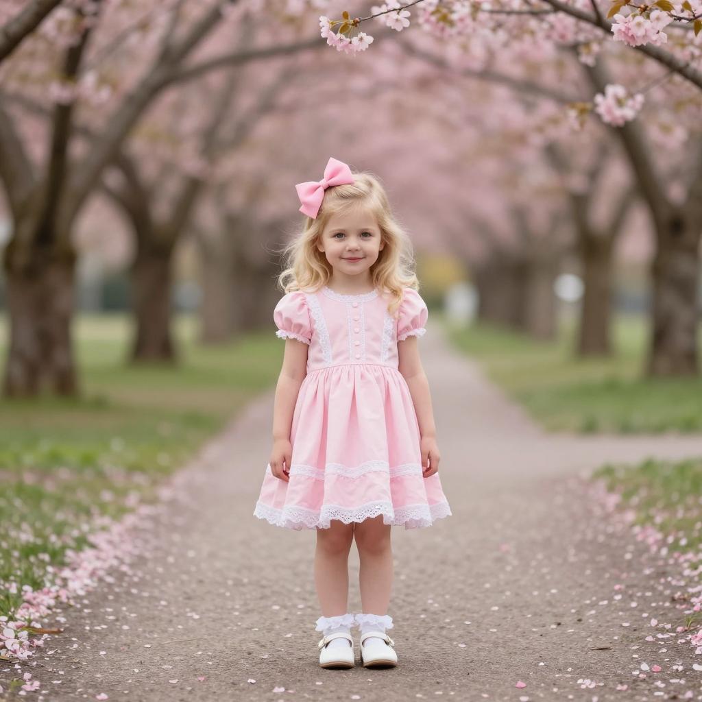 Pink girl costume, photograph of a young blonde girl standing in a pink flower-lined path, springtime, wearing a pink dress with white trim, white shoes, pink bow in hair, green grass, pink cherry blossom trees in background, soft focus, natural light, serene atmosphere, girl centered, slightly smiling, delicate, feminine, innocent, picturesque, outdoor setting, spring, floral path, child, cute