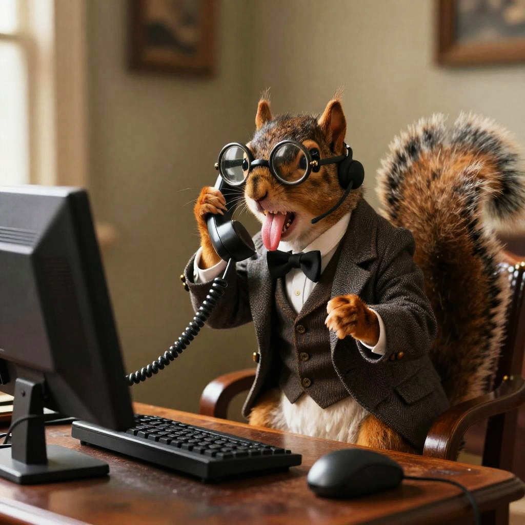 A squirrel wearing a tiny suit and monocle angrily making a phone call to tech support while sitting at a desk with a computer, captured in a Victorian steampunk and tongue-in-cheek scene full of expressive and funny actions.