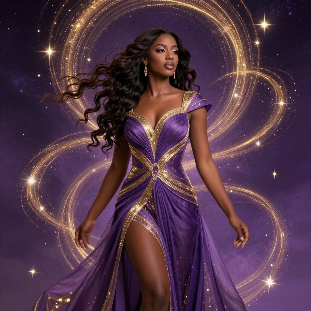 Digital artwork featuring an elegant woman with dark skin and flowing hair, dressed in a radiant purple and gold gown. She is surrounded by swirling golden patterns and stars against a cosmic purple background, evoking a celestial and magical atmosphere.