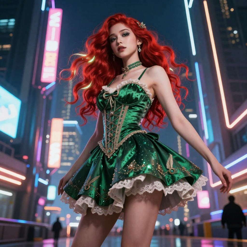 Red hair green dress character posing dynamically in a futuristic cityscape, neon lights reflecting off sleek metallic surfaces, hair glowing subtly with luminous strands, intricate dress design blending classic and cyber aesthetics, bold and vibrant atmosphere, sci-fi fantasy fusion.