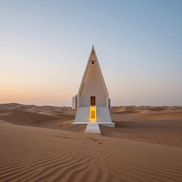 A solitary, minimalist structure emerges from a vast desert, its glowing yellow door inviting passage into an unseen realm, while the surrounding sand dunes stretch endlessly toward a serene, gradient sky.