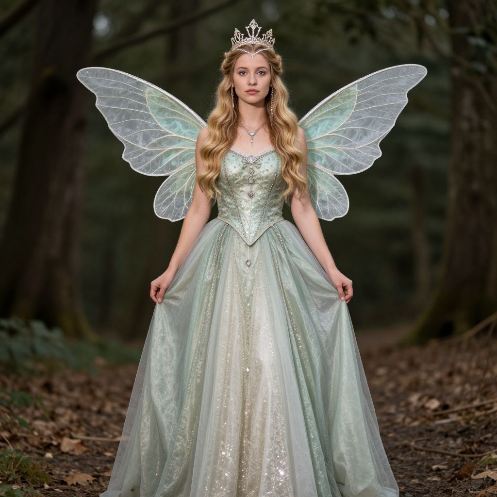 Photograph of a fair-skinned woman with long blonde hair, wearing a silver tiara, translucent fairy wings, and a shimmering green gown,