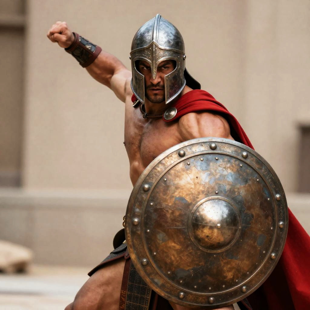 Photograph of two muscular ancient warriors with bronze helmets and red capes, holding spears and shields, standing in a rocky, cloudy background. Both have intense expressions. More warriors with similar gear fill the background.