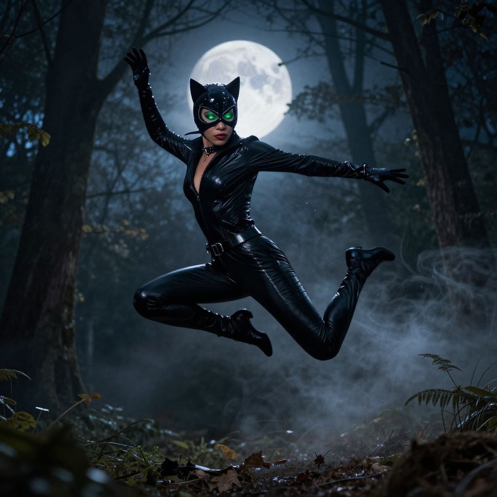 Ebony Catwoman leaping through a moonlit forest, her dark suit blending with the night, glowing emerald eyes, fluid motion captured mid-air, mystical vibe, mist swirling around
