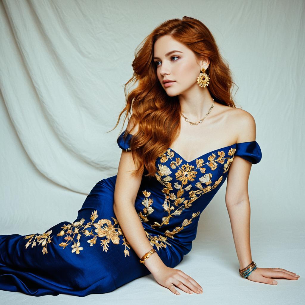 Full body, 1girl, solo, refined lady with deep chestnut braids and calm hazel eyes reflecting wisdom, blue dress, bare shoulders, elegant posture, detailed embroidery on dress, golden earrings, vivid fabric texture, gentle wind in hair, graceful silhouette, intricate side braid, pear-shaped pendant necklace, tie back blue ribbon, standing tall with one foot slightly forward, white background