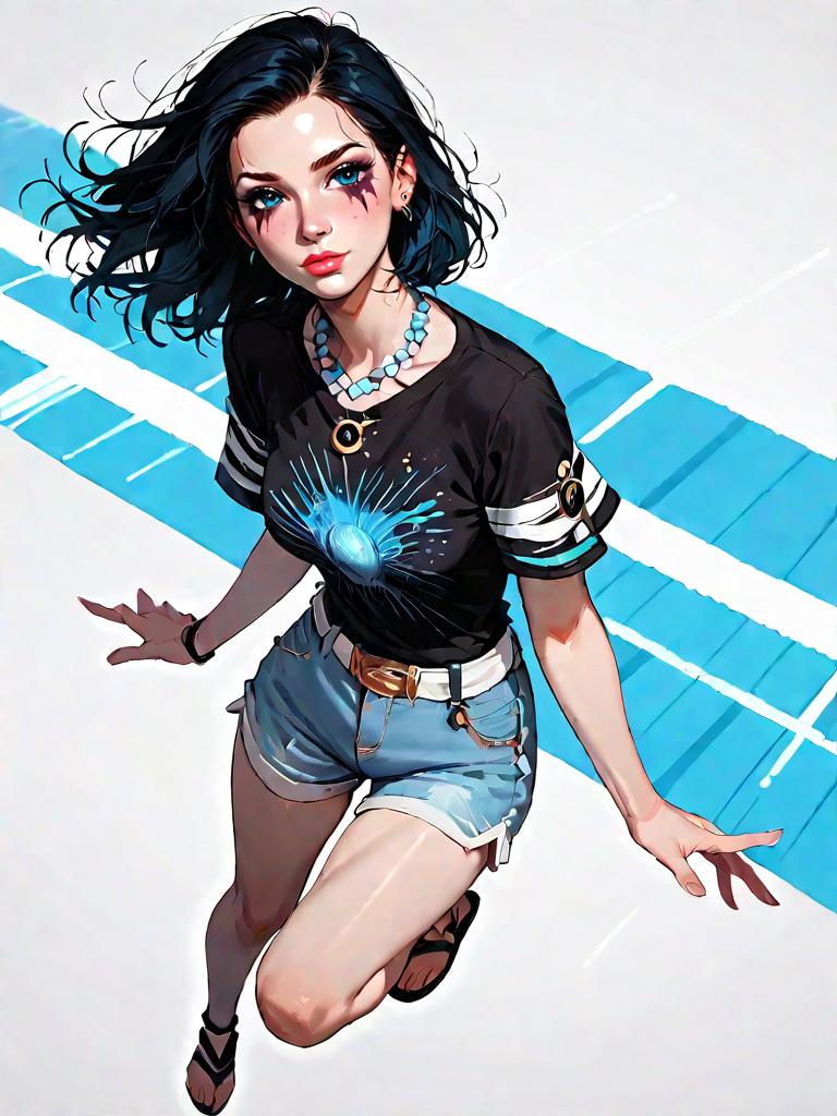 1girl, source_comics, realistic face, full body shot, Woman, casual chic, navy blue V-neck T-shirt with short ruffle sleeves, mustard and white striped high-waisted shorts with a tie belt, black strappy flat sandals, layered necklaces, natural makeup look, indoor retail space with bright lighting and clothing racks in the background.
