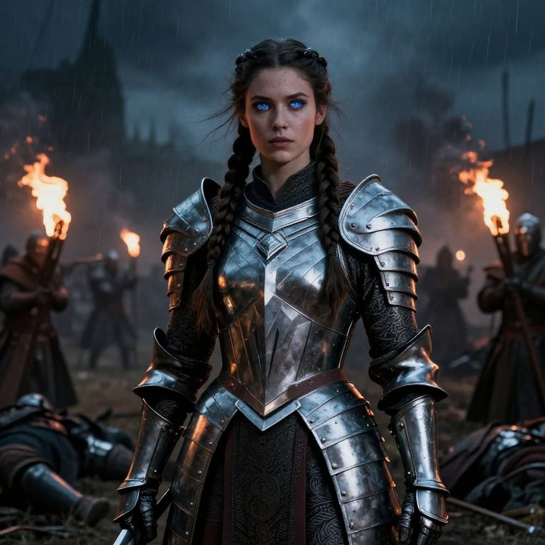 A heroic warrior princess dressed in intricate metallic armor with bold geometric patterns, standing in a medieval battlefield during a stormy night, her face sharp and noble with glowing blue eyes and long braided dark hair, the armor emits a subtle shimmer, surrounded by fallen soldiers and torchlight, deep shadows and smoke in the background.
