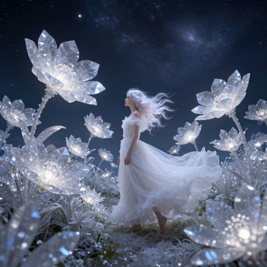 Photorealistic digital art: Victorian girl in blue dress stands in vibrant flower garden inside a glass snow globe, with a starry, galaxy-filled night