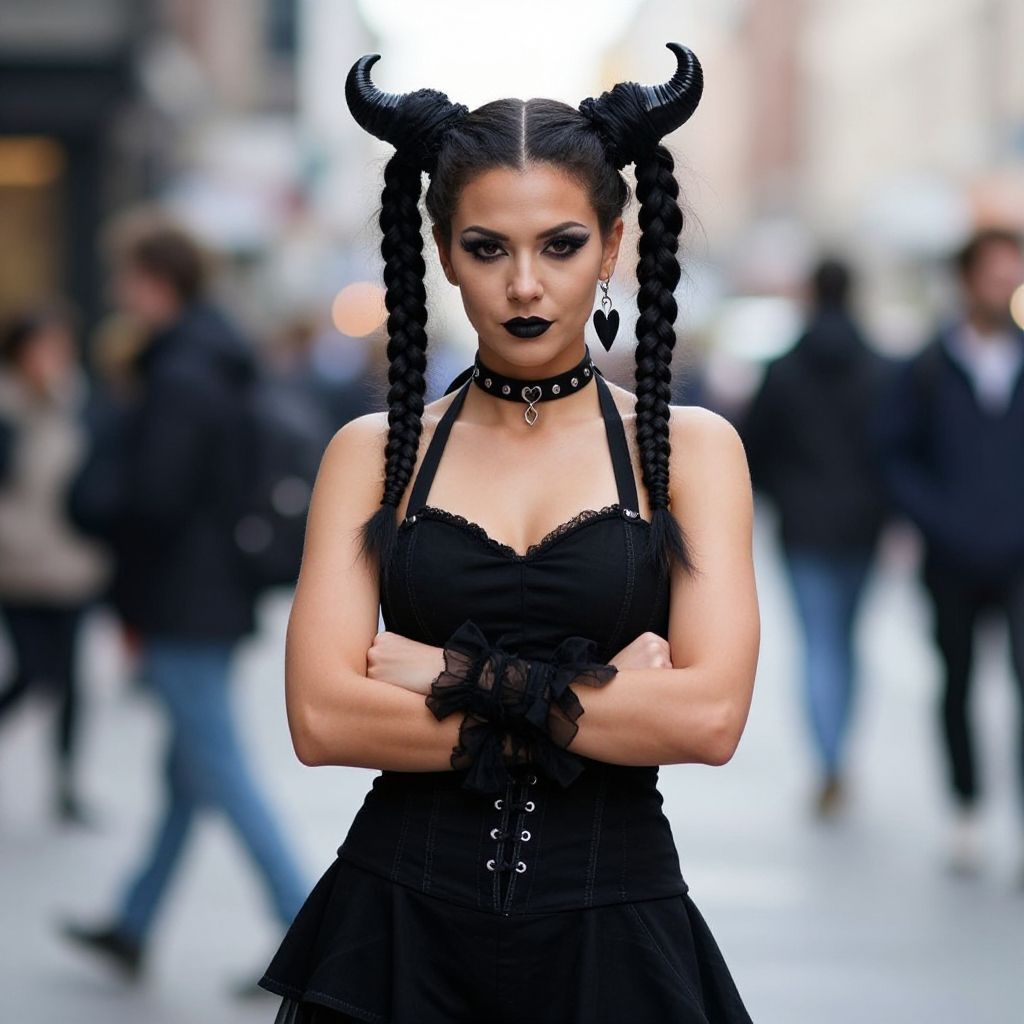 A confident woman dressed in a black Cruella-inspired costume stands with arms crossed on a city street. She features braided twin pigtails that curl into horn-like shapes, complemented by bold makeup and a choker, showcasing a striking gothic fashion style. The blurred background of passersby emphasizes her dramatic look and fierce expression.