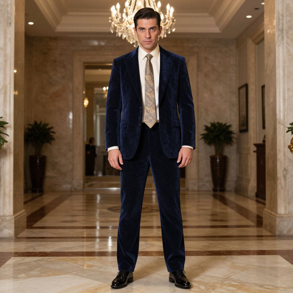 A man, midnight blue velvet suit, ivory silk shirt, paisley tie in gold tones, black patent leather shoes, grand marble foyer, crystal chandeliers, pinhole camera style, confident expression, luxurious ambiance. Man has masculine face and piercing eyes