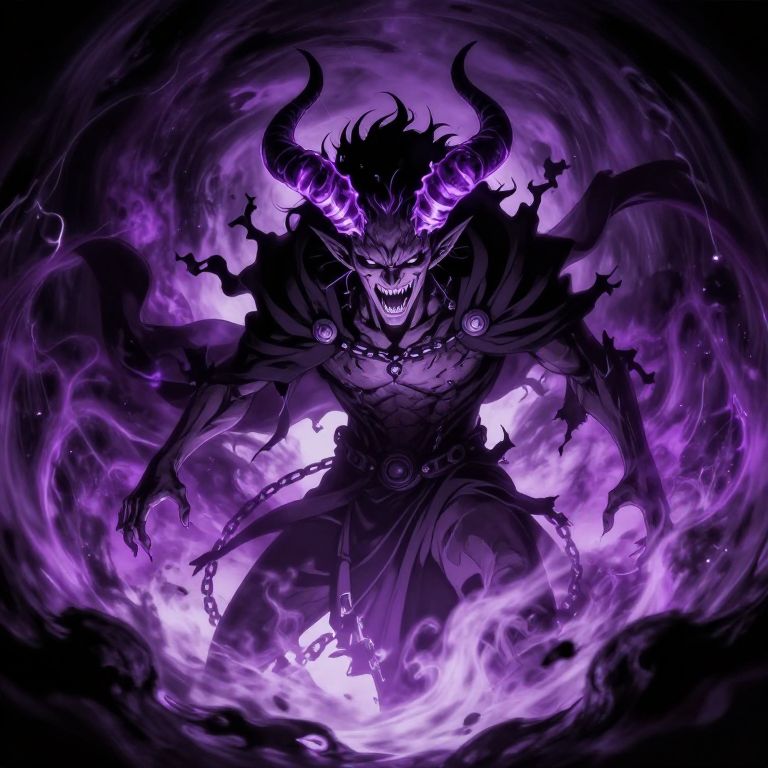 This digital artwork depicts a menacing, dark demon with glowing purple horns and eyes, set against a swirling, smoky background. The demon's sharp teeth are bared in a snarl, and its muscular, humanoid body is adorned with a tattered cloak and chains. The cloak's edges are jagged, and the chains dangle menacingly from its waist. The dominant colors are deep purples and blacks, with bright purple highlights around the demon's horns and eyes. The swirling smoke and glowing light create a sense of movement and power. The overall style is dynamic and dramatic, with a focus on contrast and intensity.