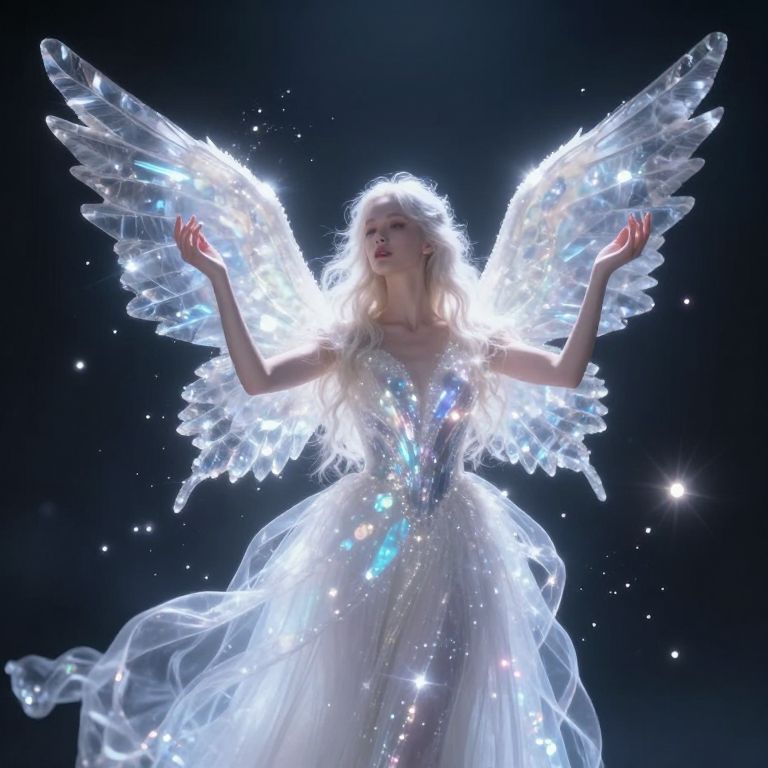 Photorealistic CGI of a glowing, ethereal blonde angel with translucent wings, wearing a shimmering white dress, set against a dark, starry
