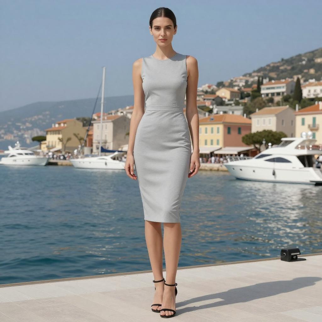 Photograph of a slender woman with fair skin and dark hair in a sleek bun, wearing a form-fitting, sleeveless, light gray knee-length dress and black strappy heels. She stands on a white dock with a calm blue sea and a marina in the background, featuring white yachts and a coastal town with colorful buildings and green hills under a bright blue sky.