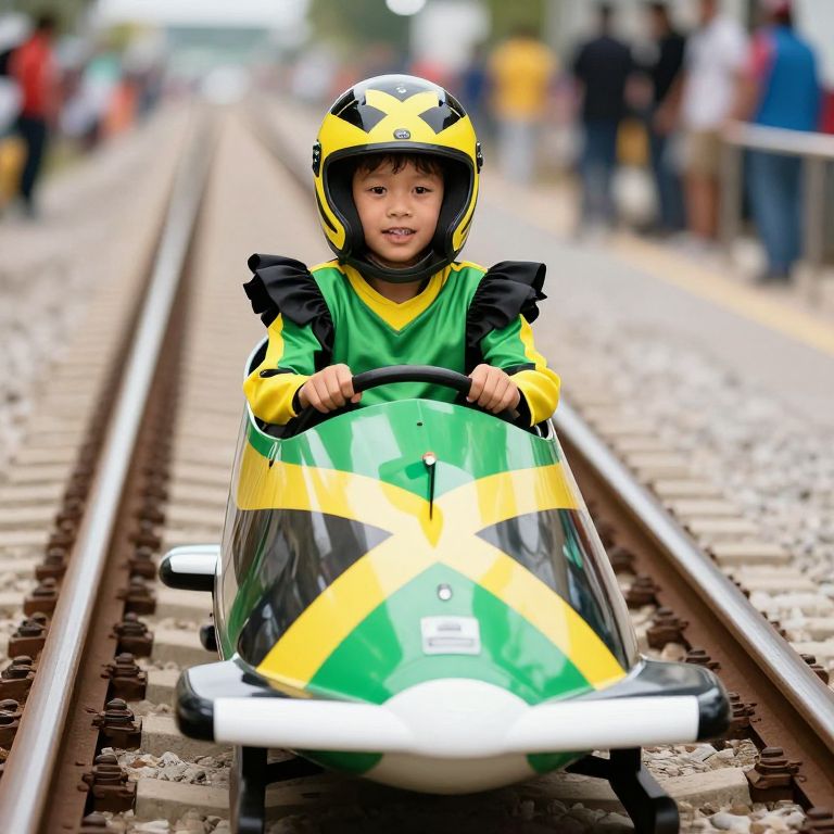 Jamaican Bobsled Fancy Dress, a close up of a young boy sitting on a train track