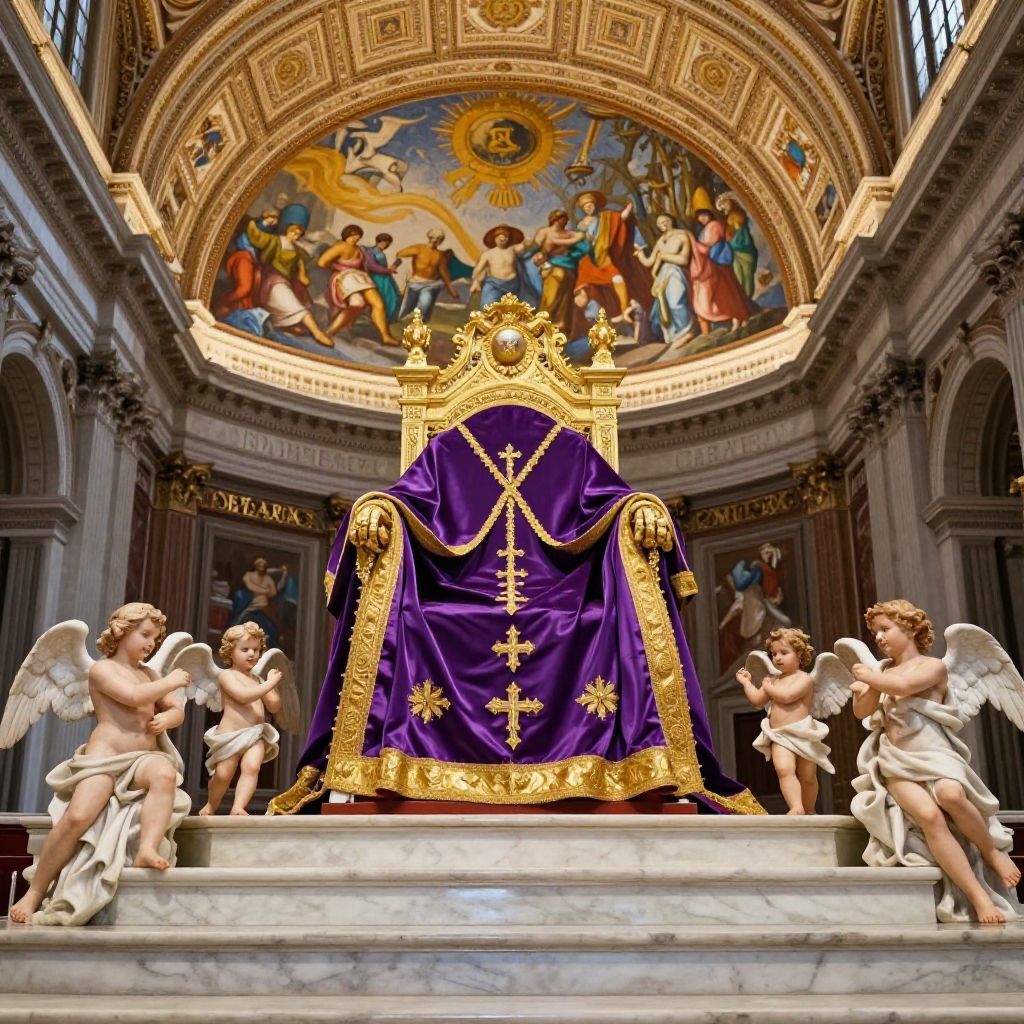 Pope throne elevated on marble steps, draped in royal purple and gold, surrounded by angels and cherubs sculptures, under a towering vaulted ceiling filled with colorful murals