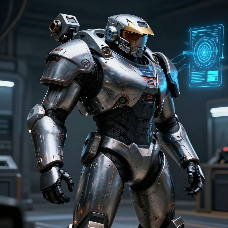 This is a CGI image of a futuristic, armored humanoid robot in a dark, industrial setting. The robot has a sleek, silver metallic body with intricate detailing and glowing blue accents. It wears a yellow-tinted visor over its face, and its chest plate features a red and blue emblem. The robot's right shoulder has a smaller, secondary arm. In the background, there's a glowing blue holographic interface with a circular symbol, and dimly lit control panels. The overall style is reminiscent of sci-fi video game aesthetics, with a focus on high-tech, metallic textures and futuristic design elements.