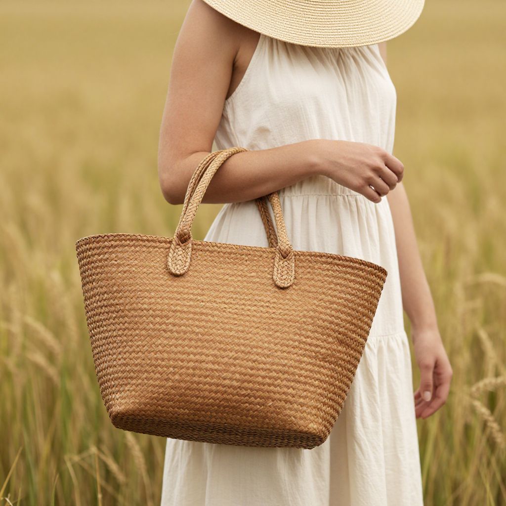 Photograph of a woman standing in a golden wheat field. She wears a wide-brimmed straw hat and a sleeveless, white, flowing dress. Her right arm is bent, holding a large, textured, tan woven handbag with two handles. The background is blurred, emphasizing the tall, yellow-green wheat. The woman's skin is light, and only her torso and arm are visible. The handbag's intricate woven pattern contrasts with the smooth fabric of her dress. The overall style is casual and summery, with a natural, earthy color palette.