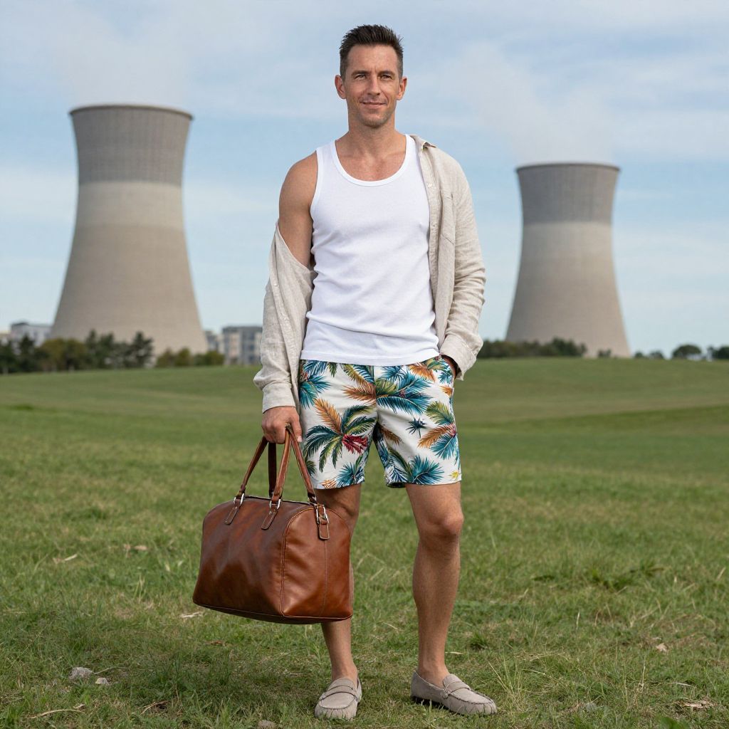 A man, crisp white modal blend tank top, tailored tropical print shorts, lightweight taupe suede loafers, soft beige linen overshirt, elegant leather duffel bag, cooling towers, sprawling green fields, blue sky backdrop, pinhole camera style, relaxed smile. Man has masculine face and piercing eyes