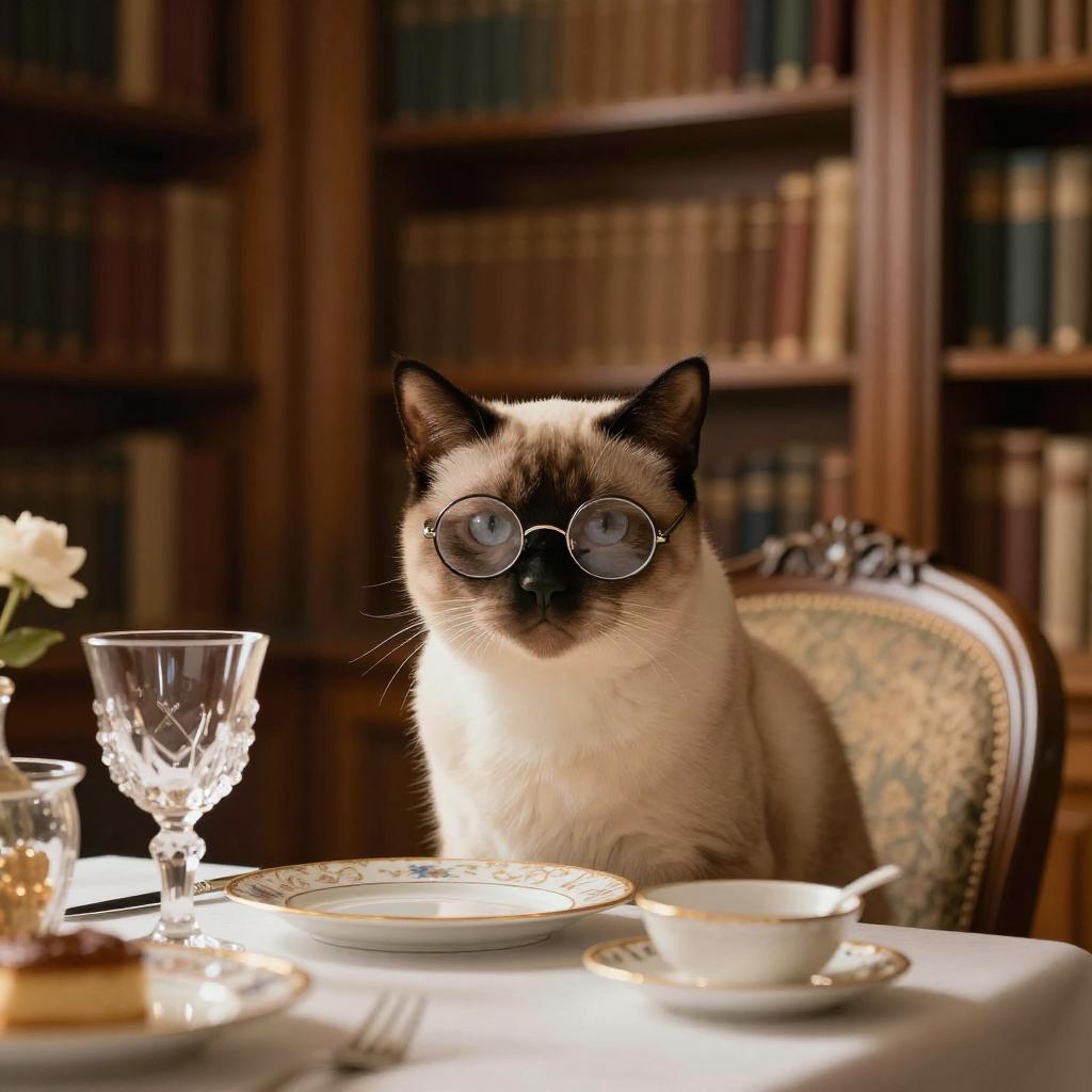 Wise elderly Siamese cat wearing round glasses seated at a fine dining table in a sunlit vintage library with towering wooden shelves, with crystal and porcelain plateware, f/1.4 200mm zoom shallow depth of field, ultra sharp photograph, (soft afternoon golden hour light:1.3) (masterpiece:1.2) (photorealistic:1.2) (bokeh) (best quality) (intricate) (8k) (HDR) (cinematic lighting) (sharp focus)