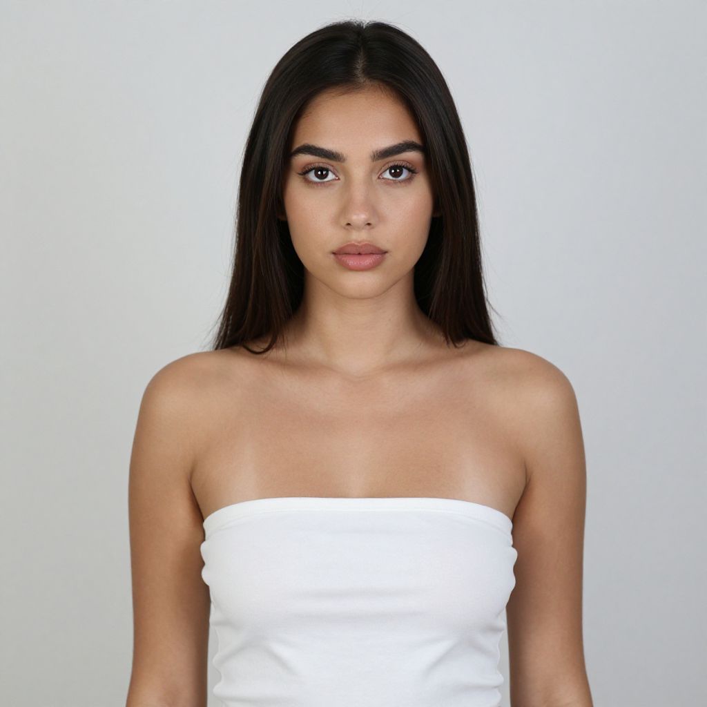Photograph of a young woman with long, straight black hair and medium brown skin, standing against a plain white background. She has large, dark brown eyes, well-defined eyebrows, and full lips. She is wearing a strapless white top that reveals her shoulders and upper chest. Her expression is neutral, with a slight, closed-mouth pout. The lighting is even, highlighting her facial features and the smooth texture of her skin. The image has a clean, minimalist style with a focus on her face and upper body.
