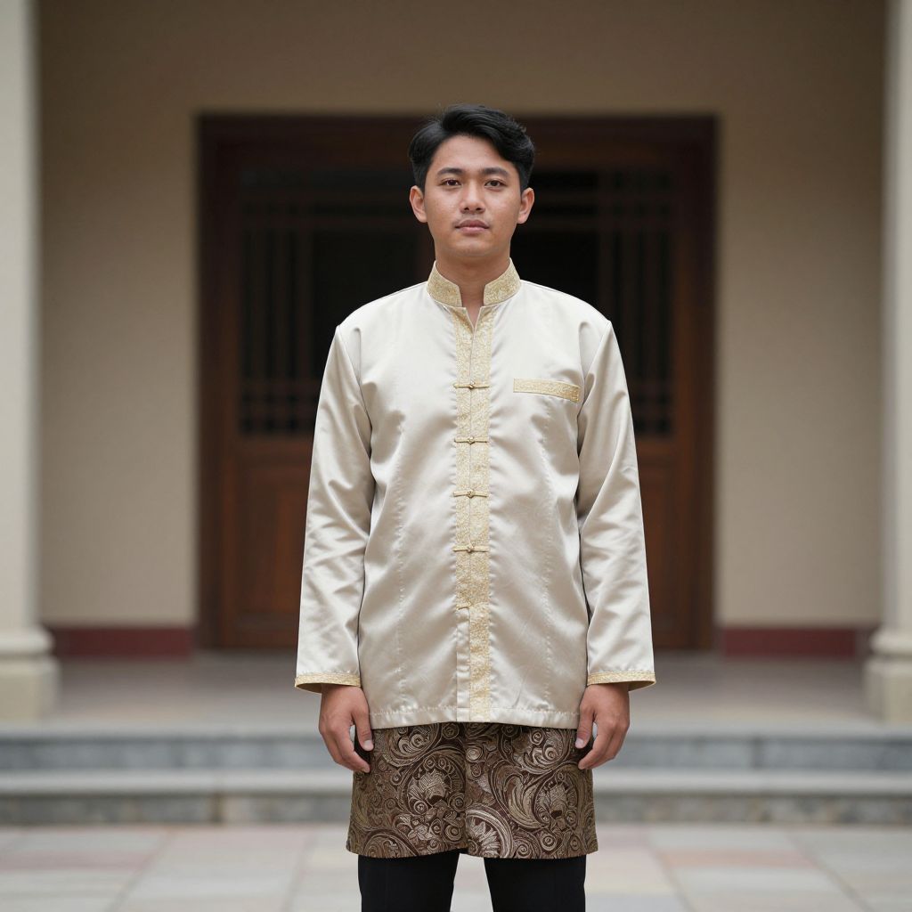 Photograph of a young Asian man with short black hair, wearing a shiny gold silk traditional shirt and patterned brown skirt, standing in front of a