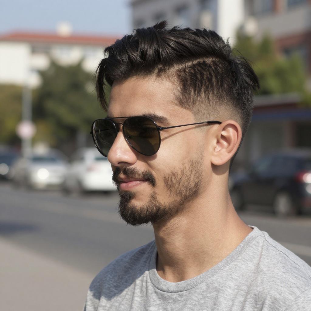 Photograph of a young man with a stylish undercut haircut, where the top is dark and voluminous, and the sides are closely shaved. He's wearing black, aviator-style sunglasses and a gray t-shirt. His beard is neatly trimmed, and he's looking off to the side with a slight smile. The background is slightly blurred, showing a sunny outdoor setting with trees and buildings.