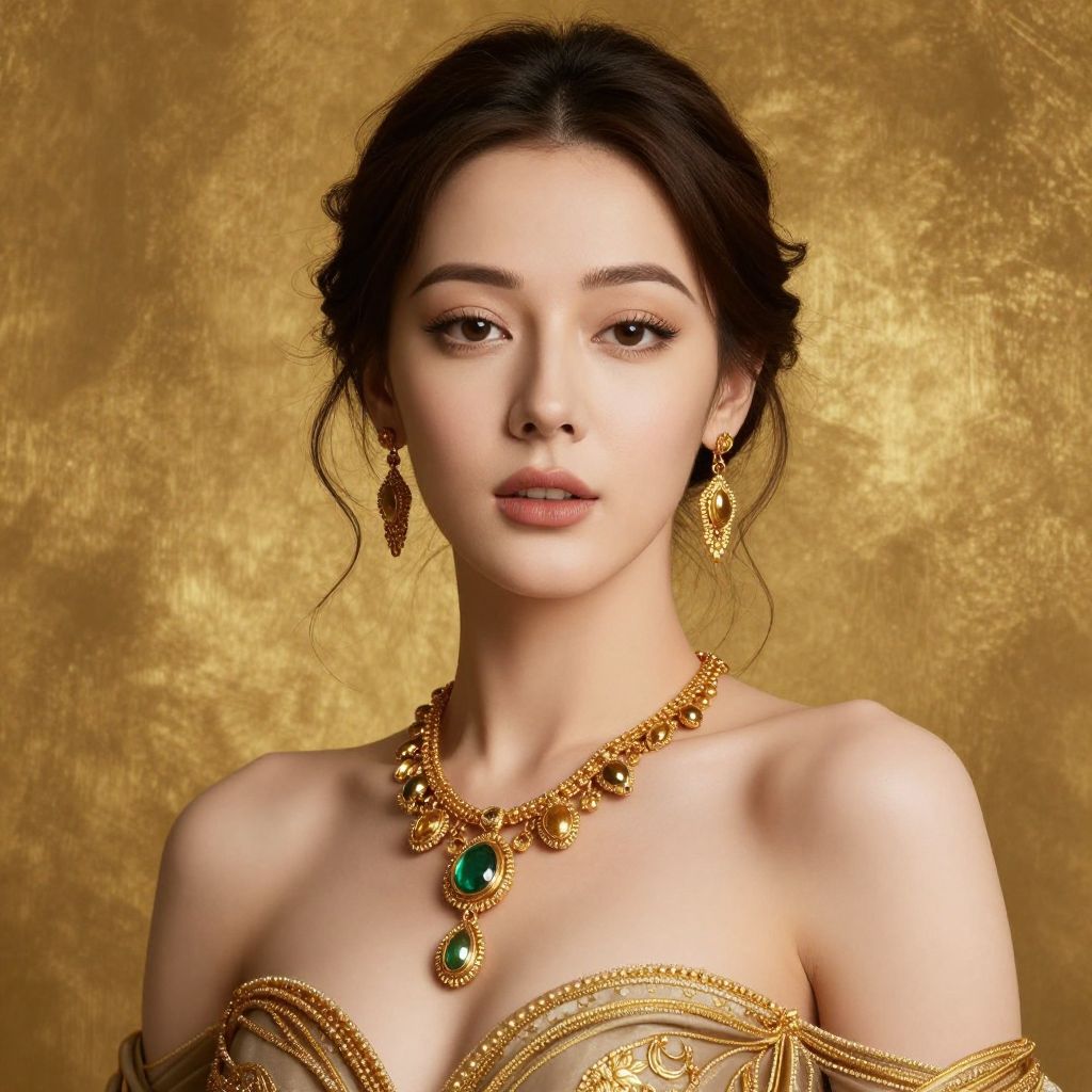 Photograph of an East Asian woman with fair skin and dark, wavy hair styled in an elegant updo. She has almond-shaped brown eyes, full lips, and a calm expression. She wears an ornate gold necklace with two green emeralds, matching gold earrings, and an off-the-shoulder, gold-embellished top. The background is a textured, metallic gold, enhancing the luxurious feel. Her makeup is subtle, highlighting her natural beauty. The lighting is soft, creating a warm, regal atmosphere. The image has a high-fashion, editorial style.