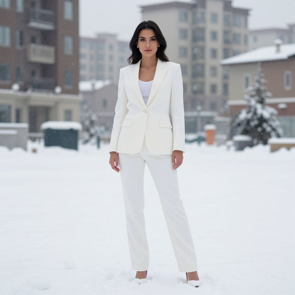 Photograph of a woman standing in a snowy urban setting. She has long, dark hair, fair skin, and is wearing a white blazer and matching white pants with a white top underneath. She stands confidently with her hands by her sides, looking directly at the camera. The background shows blurred, multi-story buildings with snow-covered roofs and a snow-covered tree to the right. The overall color palette is dominated by white and gray, with the snow adding a bright contrast to the cityscape. The image has a sharp focus on the woman, with a softly blurred background.