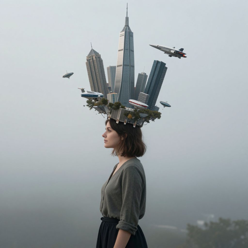 A woman stands serenely against a foggy backdrop, her head crowned by a miniature, gravity-defying metropolis that floats effortlessly above her, its skyscrapers and futuristic spacecraft suspended in mid-air as if clipped onto her like a whimsical hat.
