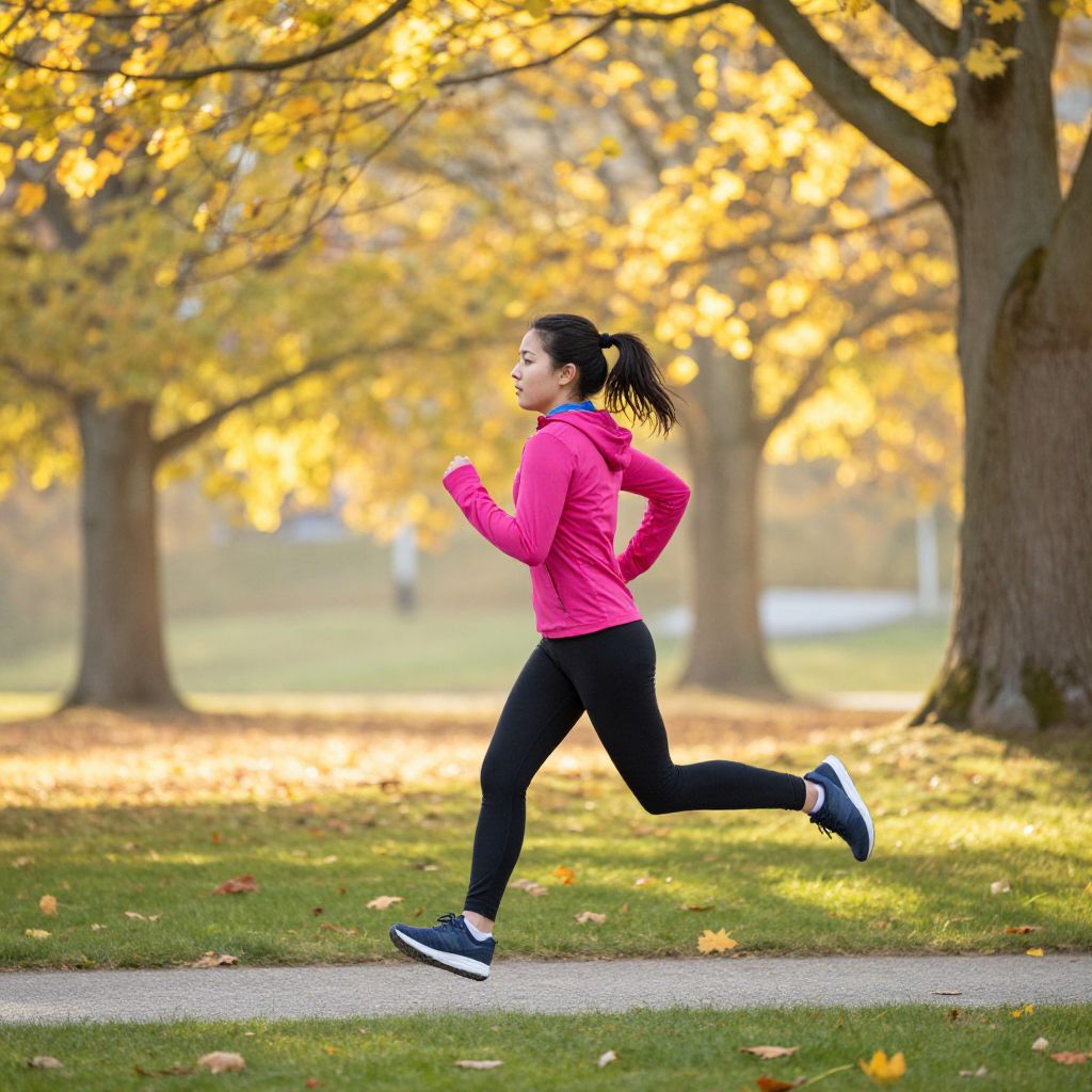 Photograph of a fit, young woman with brown hair in a ponytail, jogging in a park with autumn leaves and yellow trees. She wears a