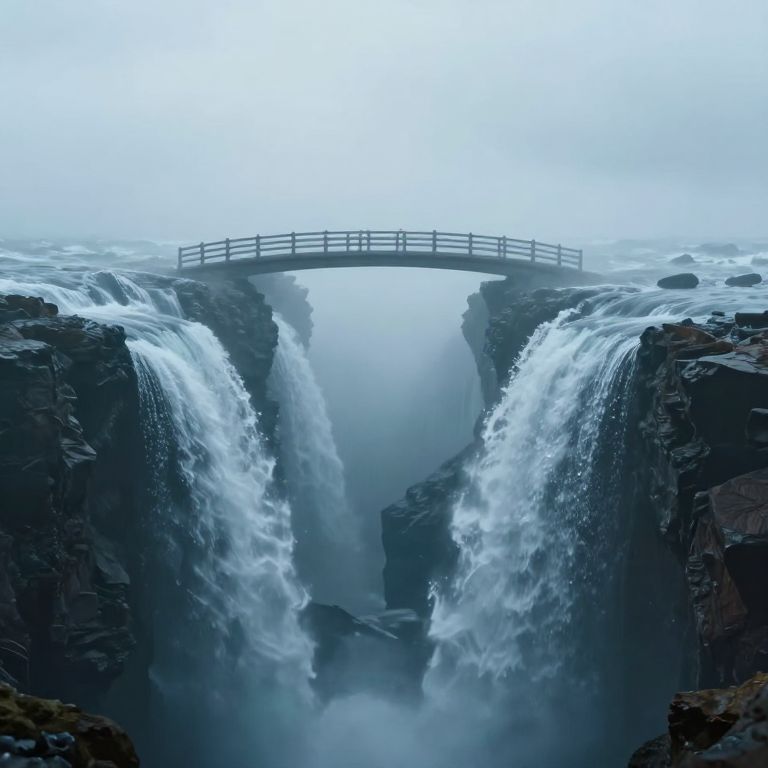Liquid light bridges two inverse oceans, where cascading waves rise like ethereal mist above and fall like solidified stone below, defying gravity in a surreal aquatic landscape.