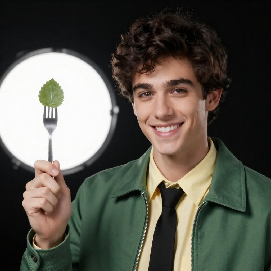 Photograph of a young man with fair skin and dark, wavy hair, smiling mischievously while holding a fork with a green leaf. He wears a green jacket over a yellow shirt and black tie. A bright, circular light source is in the background.