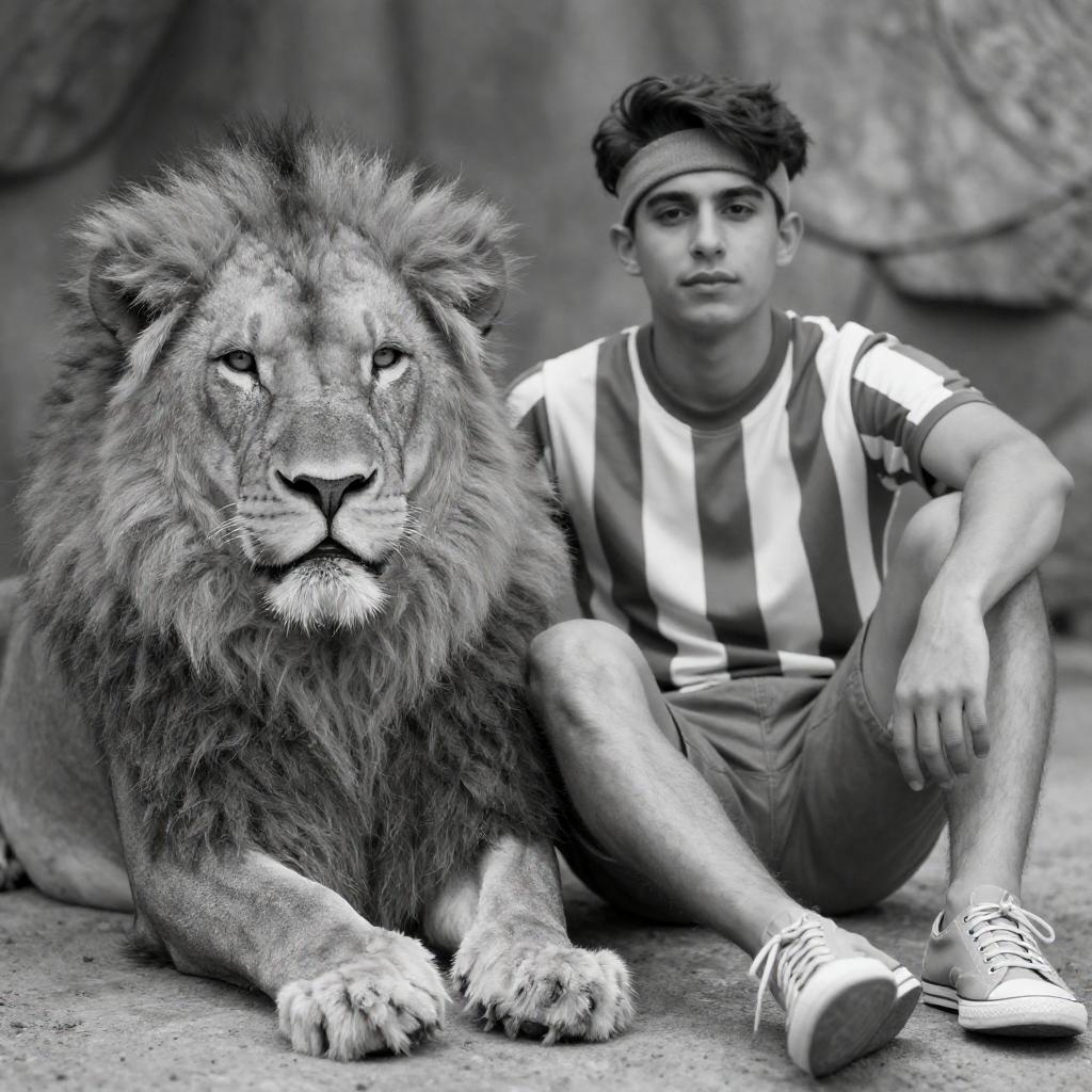 Black-and-white photograph of a young man with a headband, wearing a striped jersey and lace-up shoes, sitting beside a large, furry lion with a thick mane. Man's hand rests on lion's leg. Stone wall background. Man has a calm expression. Lion's expression is neutral. Both seated on the ground.