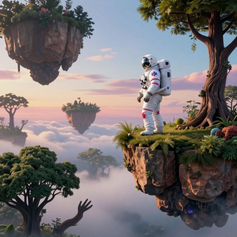 A surreal digital artwork depicting an enchanting world where gravity-defying trees grow from floating islands in a colorful sky, reminiscent of dreamlike landscapes. The focal point is an astronaut clad in a vibrant, patterned spacesuit adorned with star-shaped embellishments, standing at the edge of an island and gazing into the distance. The unique perspective reveals the inverted sky beneath his feet, while the trees below stretch upwards towards him like reaching hands amidst the misty atmosphere. This whimsical scene evokes feelings of wonder and curiosity, inviting viewers to contemplate the nature of reality and explore the enigmatic realms beyond our world.