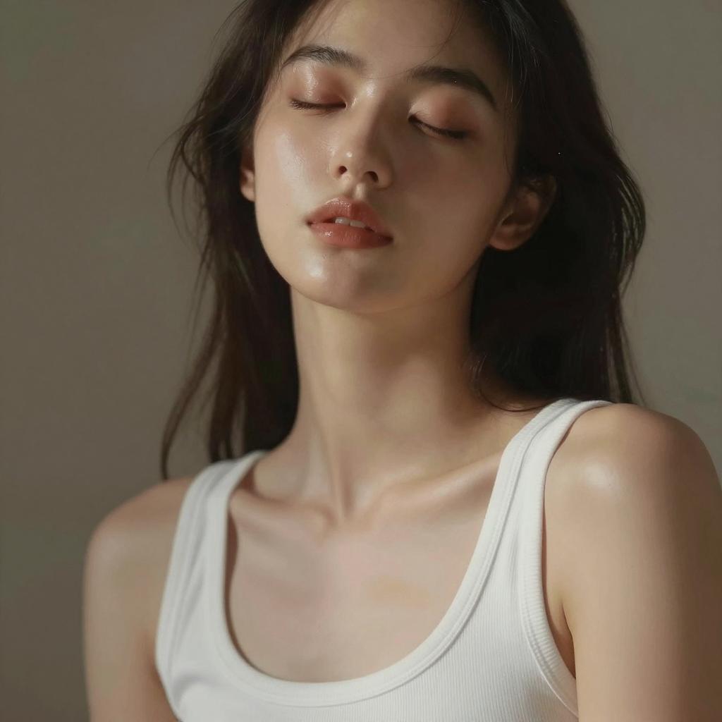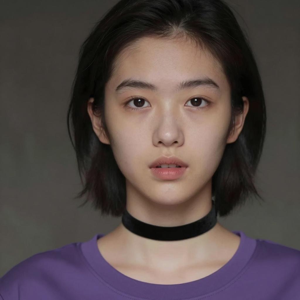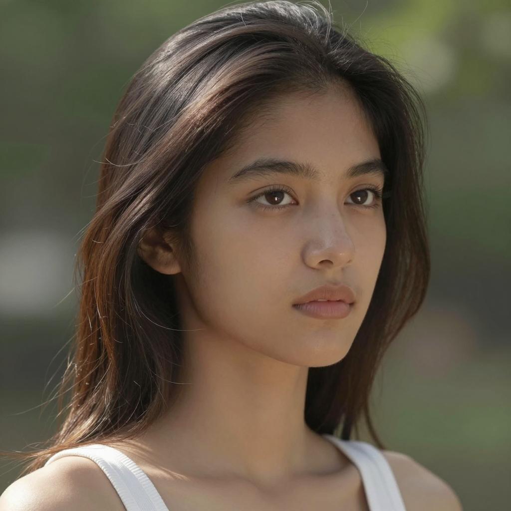 A young woman with medium brown skin, dark brown hair, and brown eyes. She gazes slightly to the right with a subtle, neutral expression. She wears a white strap over her shoulder. Sunlight highlights her hair and face. Blurred green foliage in the background.
