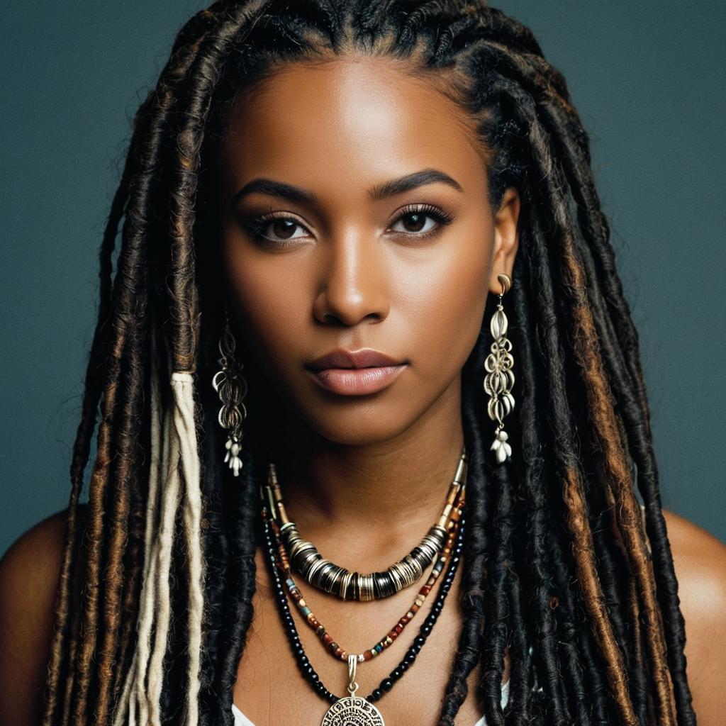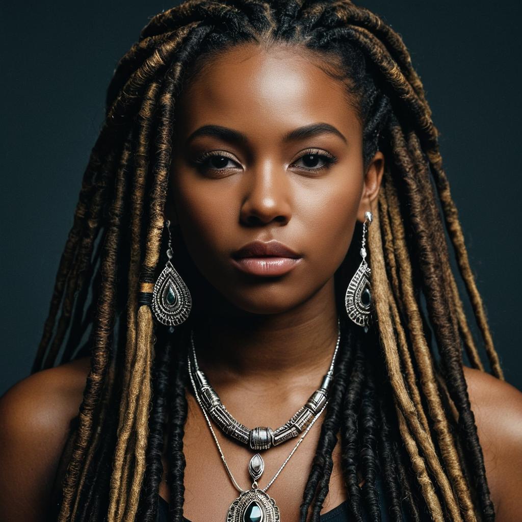 Peekaboo soft locs blue,1girl, solo, jewelry, necklace, long hair, brown hair, dark skin, realistic, dark-skinned female, lips, dreadlocks, looking at viewer