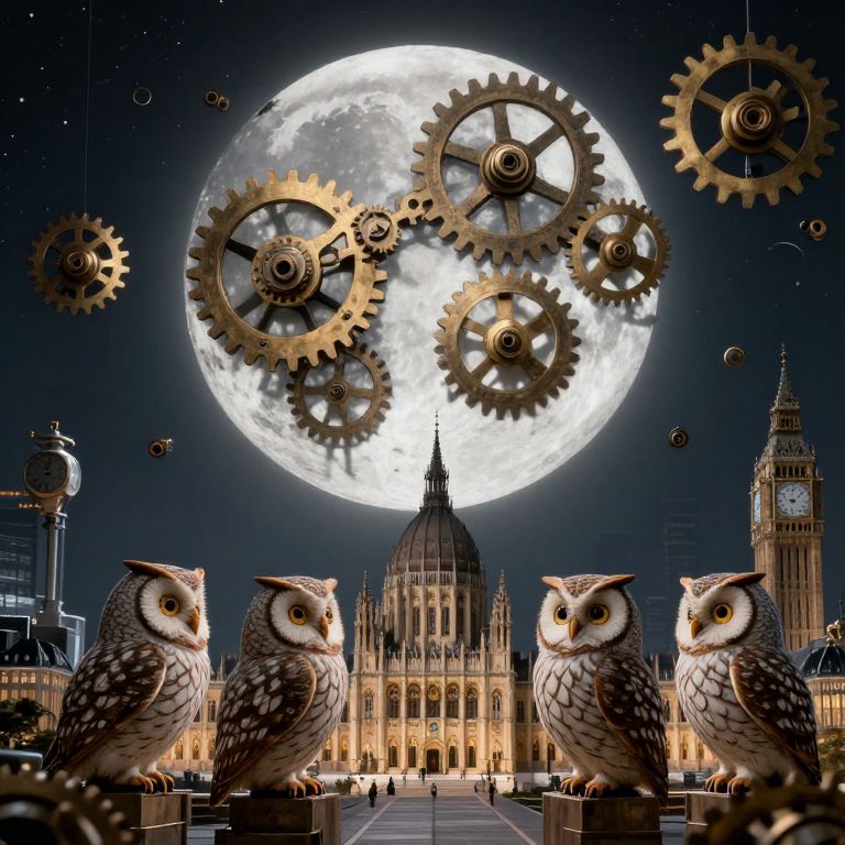 A parliament of owls debates beneath a moon made entirely of gears, casting mechanical shadows across a city of living timepieces.